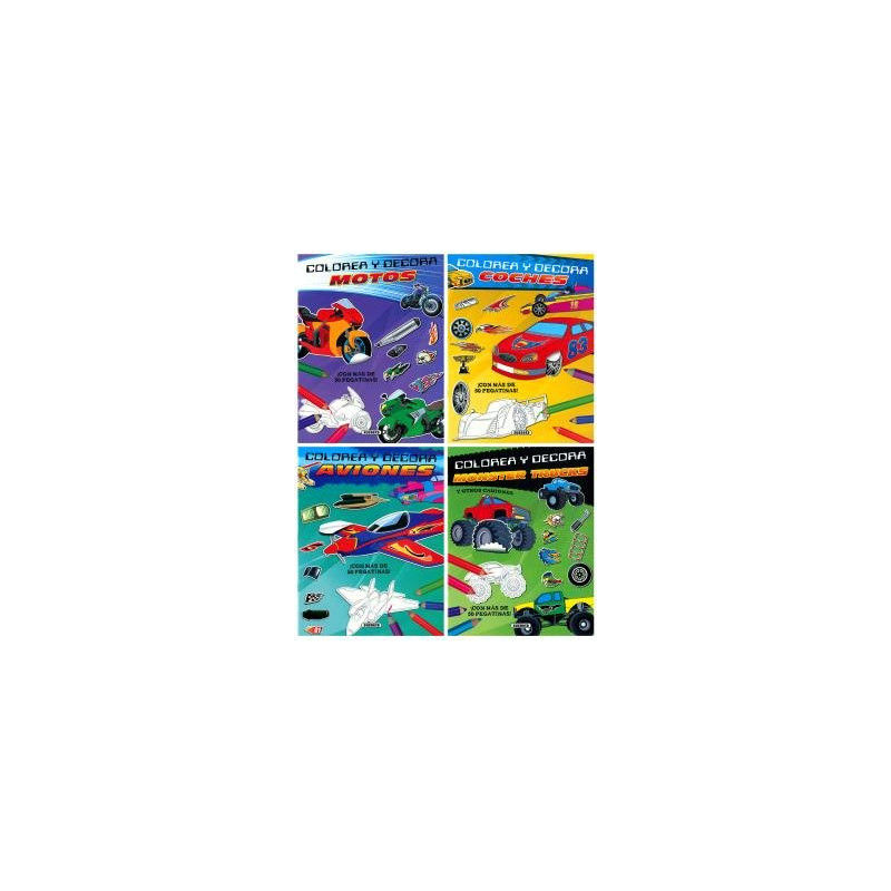Personaliza tus propias bicis, coches, motos y moster trucks con estos libros de pegatinas: escoge una lámina, colorea el dibujo, añade las pegatinas y... íYa lo tienes!